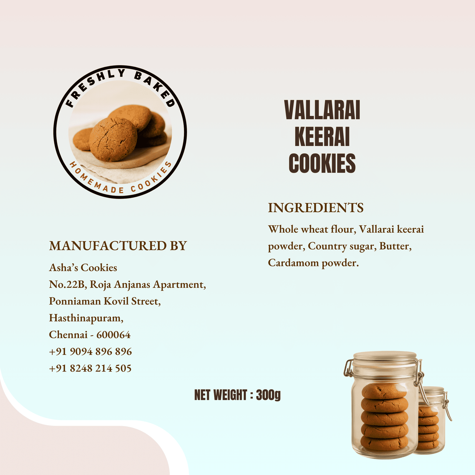 Vallarai Keerai cookies, Murungai Keerai cookies, Avarampoo cookies, Hibiscus cookies, Vendhya Keerai cookies each 300g per box, Best within 45 days.