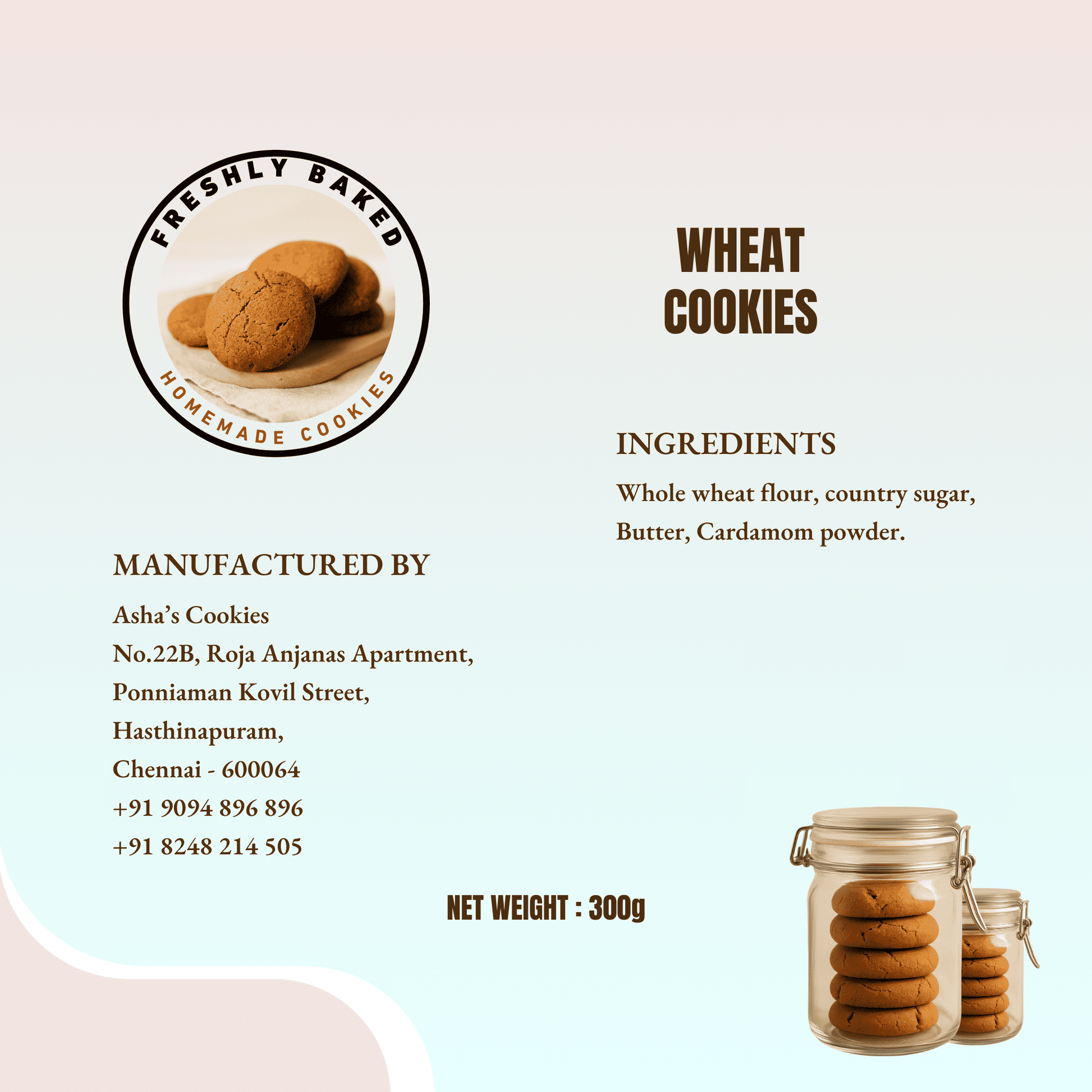 Asha’s Cookies are handmade in small batches using wholesome ingredients. We do not use maida (refined flour), white sugar, preservatives, baking powder, or baking soda. Every batch is crafted for freshness and healthy goodness.